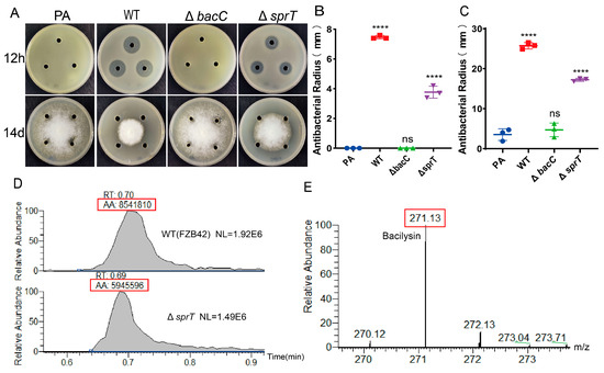 Effect of ΔsprT on the bacilysin production of B. velezensis FZB42. (A) Antagonism of the strains’ culture supernatant toward S. aureus ATCC-9144 and P. sojae. One representative plate out of three replicates is shown. S. aureus ATCC9144 is on the top; P. sojae is on the bottom. (B) Statistics of antagonism radii of the strains toward S. aureus ATCC-9144 incubated overnight (B) and P. sojae incubated at 25 °C for 14 d (C). In panel (C), the antagonism radius was defined as the nearest distance from the edge of P. sojae to the hole center (mm). (D,E) HPLC-MS analysis of bacilysin produced by the FZB42 wild type and ΔsprT. T-test was performed, where **** p < 0.001.
