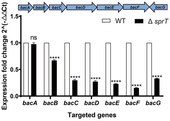 The production of bacilysin in the ΔsprT mutant may result from lowered biosynthesis and exportation. To pinpoint which process is affected in the ΔsprT mutant, we first examined the transcription of the bac operon which encodes the synthetases for bacilysin production. The bac operon is composed of bacA, bacB, bacC, bacD, bacE, bacF, and bacG genes. Using qPCR, we found that almost all of the genes were significantly down-regulated in ΔsprT, except for the bacA gene. In particular, the transcript levels of the downstream parts of the bac operon, that is, bacC–bacG, were no more than half the level of what was expressed in the wild type (Figure 5). These results suggest that ΔsprT affects the production of bacilysin at the level of transcription.