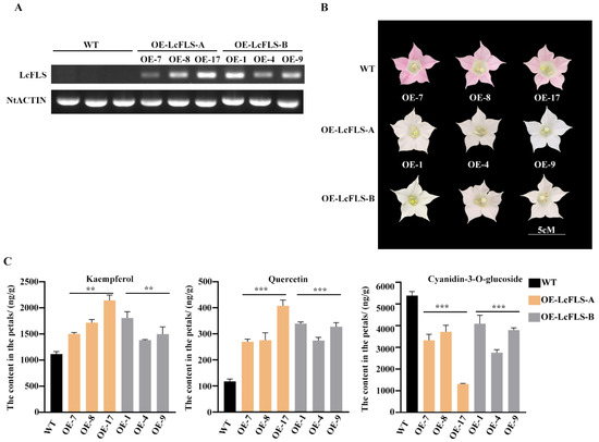 Both LcFLS alleles were overexpressed in tobacco, using the CaMV 35S promoter. Six independent transgenic lines of tobacco overexpressing LcFLS were successfully isolated from Hyg resistance selection, and their progenies (T3 generation) were generated (LcFLS-A OE-7,8,17 and LcFLS-B OE-1,4,9). We examined LcFLS transcript abundance in transgenic tobacco petals by semiquantitative RT-PCR (qPCR). As can be seen from the result of agarose gel electrophoresis, the LcFLS gene were highly expressed in transgenic petals, but no bands were amplified in wild-type (WT) tobacco (Figure 1A). Compared with the pink flower of the WT, the flower color of OE-LcFLS-A and OE-LcFLS-B transgenic tobacco becomes lighter and almost white; however, there is no significant difference between them (Figure 1B).
