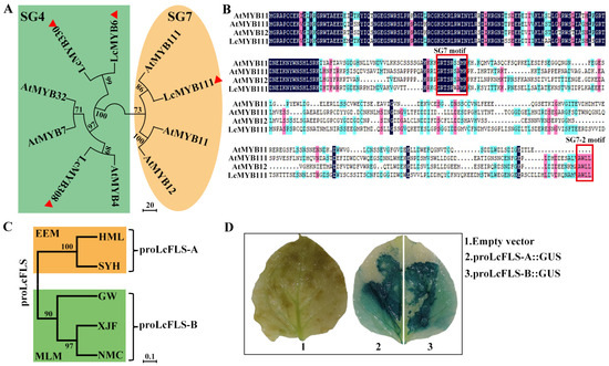 Phylogenetic analysis of four candidate LcMYB transcriptional factors and two allelic proLcFLS. (A) Phylogenetic tree of SG4 and SG7 R2R3-MYB family members in litchi and Arabidopsis. The phylogenetic tree was constructed using the neighbor-joining method in the MEGA-X software with 1000 bootstrap replicates. The numbers at the nodes indicate the bootstrap values, with cutoff no less than 50. (B) Sequence alignment of LcMYB111 with known flavonol regulators AtMYB11, AtMYB12, and AtMYB111. The alignment was generated using the DNAMAN 6.0 software. The R2 and R3 repeats of the MYB domain, as well as S7 motif (GRTxRSxMK) and SG7-2 motif [(W/x)(L/x)LS] which were denoted by red rectangle were found in LcMYB111 sequence. (C) The phylogenetic tree of LcFLS promoters cloned from EEM cultivars (‘SYH’ and ‘HML’) and MLM cultivars (‘NMC’, ‘XJF’, and ‘GW’). The phylogenetic tree was generated using the neighbor-joining method in the MEGA-X software with 1000 bootstrap replicates. (D) Analysis of GUS activity of proLcFLS-A and proLcFLS-B. 1: Empty vector, 2: proLcFLS-A::GUS, 3: proLcFLS-B::GUS.