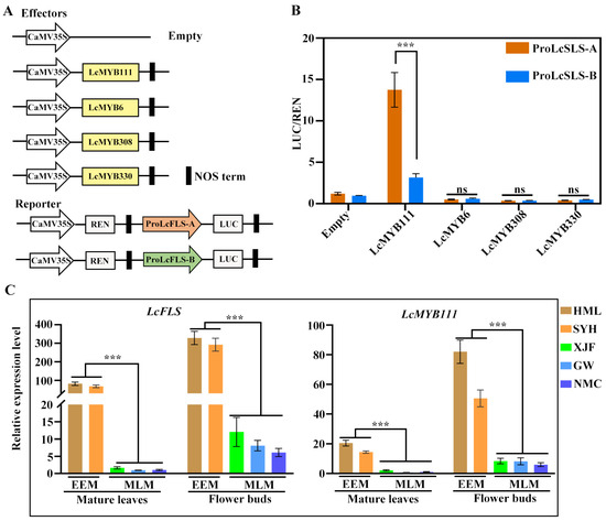 To explore the correlation between the expression level of LcFLS and the four R2R3-MYB genes in litchi EEM and MLM cultivars, the transcript levels of LcFLS and the four R2R3-MYB genes in mature leaves and flower buds of the representative EEM cultivars (‘SYH’ and ‘HML’) and MLM cultivars (‘NMC’, ‘XJF’, and ‘GW’) were analyzed using qRT-PCR. As shown in Figure 3C, the transcript levels of LcFLS and LcMYB111 in mature leaves and flower buds were generally significantly higher in EEM cultivars compared with MLM cultivars. In the mature leaves, the LcFLS transcript levels were 82- and 68-fold higher in EEM cultivar ‘HML’ and ‘SYH’, respectively, than in ‘NMC’. In the flower buds, the LcFLS transcript levels reached a 53- and 47-fold higher level in ‘HML’ and ‘SYH’, respectively, than in ‘NMC’. Similarly, in the mature leaves, the LcMYB111 transcript levels were 20- and 14-fold higher in EEM cultivars; in the flower buds, the LcMYB111 transcript levels were 13- and 8-fold higher in EEM cultivars than in ‘NMC’. However, there is no general difference of the expression pattern of the LcMYB6, LcMYB308, and LcMYB330 between EEM and MLM cultivars (Figure S5). Therefore, we carefully speculate that the higher expression of LcFLS in EEM cultivars may be regulated by the transcriptional activation of LcMYB111.