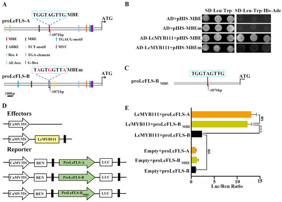 LcMYB111 regulates LcFLS gene expression by directly binding to specific MBE of proLcFLS. (A) Schematic diagram showing the predicted promoter regulatory elements of proLcFLS. Light regulatory elements MRE, ABRE, Box4, TCT-motif, HY5 binding element G-box, and transcription factor binding element MYC are marked with varied colors. Among them, the MYB-binding element of MYB111 (MBE) is marked with red, and three mutant bases of MBEm are marked with red; HY5 binding element G-box is marked with light blue. (B) Interaction of LcMYB111 with the MBE and MBEm of proLcFLS in Y1H assays. The interaction was determined by the growth of the yeast cells co-transformed with the indicated combinations of the plasmids on a synthetic dropout medium lacking Leu and Trp (SD-Leu-Trp) and a synthetic dropout medium lacking Leu, Trp, His, and adenine (SD-SD-Leu-Trp-His-Ade). AD, pGADT7; pHis, pHIS2. (C) The three bases of proLcFLS-B mutation were reverted to MBE by site-directed mutagenesis. (D) Diagram of constructs used for dual-luciferase (LUC) reporter assay as shown in (E). (E) Transcription activity analysis showed that LcMYB111 regulates LcFLS expression relying on MBE. LUC/REN ratios represent the transcription regulation activities and were normalized to the activity of control. All the bars indicate the mean ± SD of three repeated experiments (ns: no significance, *** p < 0.001; one-way ANOVA with Tukey’s tests).