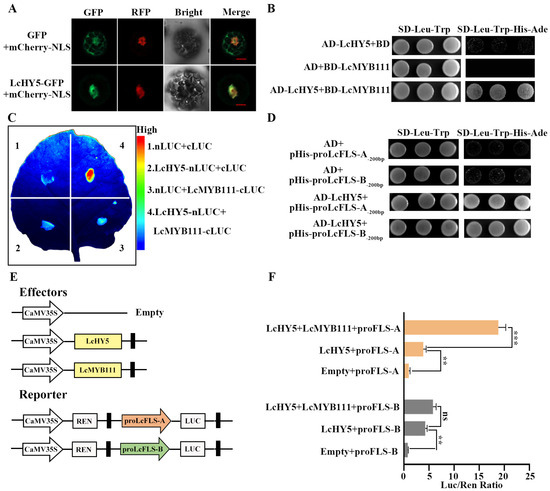 Physical interaction of LcHY5 with LcMYB111 and G-box of ProLcFLS. (A) LcHY5-GFP fusion constructs were used to determine the subcellular localization of LcHY5 in the protoplast cells isolated from Arabidopsis leaves. NLS-mCherry was used as a nuclear marker. Fluorescent images of GFP and mCherry were captured with a confocal laser scanning microscopy and are shown in green and red, respectively. Scale bars = 20 μm. (B) LcHY5 interacted with LcMYB111 in Y2H assays. Protein interaction was determined by the growth of the yeast cells co-transformed with the indicated combinations of the plasmids on a synthetic dropout medium lacking Leu and Trp (SD-Leu-Trp) and a synthetic dropout medium lacking Leu, Trp, His, and adenine (SD-Leu-Trp-His-Ade). AD, pGADT7; BD, pGBKT7. (C) LCI assay showing the interaction between LcHY5 and LcMYB111 in the leaves of Nicotiana benthamiana. Left: a representative leaf image. Right: the colored scale bar indicates luminescence intensity. (D) Binding of LcHY5 to the promoters of proLcFLS-A and -B in Y1H assays. For the yeast one-hybrid assay, an empty pHIS2.1 vector was used as a negative control. Various combinations of different constructs were transformed into the yeast strain Y187, and the protein–DNA interaction was determined based on the growth of positive transformants on SD-Leu-Trp-His-Ade. (E) Diagram of constructs used for dual-luciferase (LUC) reporter assay in Arabidopsis protoplasts as shown in (F). LcHY5 and LcMYB111 were used as effectors. (F) Transcription activity analysis showing the effect of LcHY5 and LcMYB111 on the transactivation of proLcFLS. LUC/REN ratios represent the transcription regulation activities and were normalized to the activity of control. The error bar represents the standard deviation of three biological replicates. No significance (ns), asterisk represents the statistical significance (** p < 0.01; *** p < 0.001).