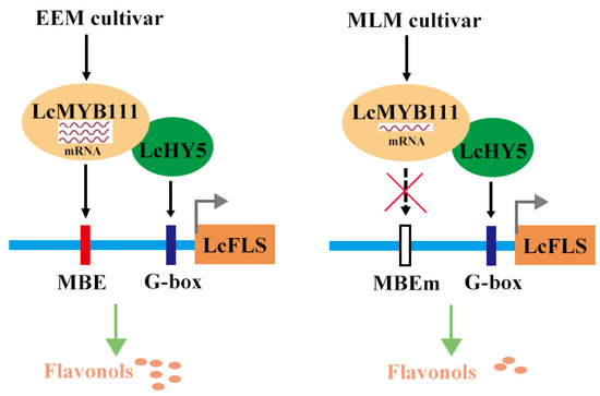 Recent studies also showed that HY5 is a positive regulator of anthocyanin accumulation through direct binding to the promoters of genes involved in anthocyanin biosynthesis [46,59]. HY5 directly binds to the G-box motifs in the promoters of anthocyanin biosynthesis genes, such as CHS, CHI, FLS, MYB111, and MYB12, thereby regulating anthocyanin biosynthesis in Arabidopsis [44]. MdHY5, PyHY5, and AtHY5 recognize and bind G-box elements in the promoters of MdMYB10, PyMYB10, and AtMYB111 [43,46,47], enhancing their expression, and promote the accumulation of anthocyanins. In this study, we obtained the homologous LcHY5 in litchi which localized in the nucleus (Figure 5A). We performed Y2H, LCI, and Y1H assays, by which the interaction between LcHY5 and LcMYB111 (Figure 5B,C), as well as LcHY5 directly binding to the promoter of LcFLS, were verified (Figure 5D). Furthermore, LUC assay demonstrated LcHY5 could interact with LcMYB111 to promote LcFLS expression; interestingly, the transcription activation activity was higher with proLcFLS-A of EEM cultivars than proLcFLS-B of MLM cultivars (Figure 5E,F). Based on the above results, a working model of LcMYB111 and LcHY5 in flavonol accumulation in EEM and MLM cultivars was proposed (Figure 6).