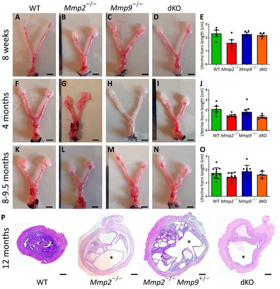 Mmp2−/− uteri are shorter in size compared to those of the WT. Representative photographs of 8-week old (A–D), 4-month old (F–I) and 8–9.5-month old (K–N) diestrus-stage uteri collected from all 4 genotypes: WT, Mmp2−/−, Mmp9−/− and dKO. Measurements of the uterine horn length demonstrated that Mmp2−/− were shorter at all ages (E,J,O), but not significantly. (P) Nulliparous uterine cross-section of Mmp2−/−, Mmp2−/−Mmp9+/− and dKO, showing significant enlargement of the lumenal area and very thin myometrial layer (compare the lumen indicated by the asterisks). Bar = 4 mm in (A–D), (F–I) and (K–N) and 200 µm in (P).