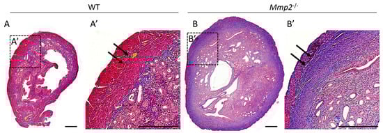 Mmp2−/− nulliparous females demonstrate accumulation of collagen fibrils in their uterus. (A,B) Transverse sections from 8M-old WT and Mmp2−/− nulliparous uteri stained with Masson’s trichrome to recognize collagen fibrils (blue, arrows). (A’,B’) Magnified area in A and B. Bar = 200 µm.