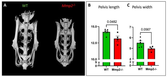 Mmp2−/− nulliparous females demonstrate smaller pelvic bones. (A) 3D morphometric representation of pelvic bones of WT and Mmp2−/− 8 M old females. (B,C) Measurements of the pelvic bones’ length and width showed significantly shorter pelvises and a tendency towards a smaller space in the pelvises of Mmp2−/− females (n = 5 and 4 for WT and Mmp2−/−, respectively).