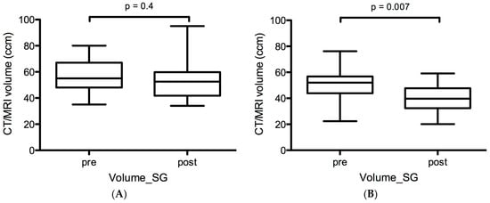 In cohort A (before vs. after LuPSMA RLT), no significant volumetric size changes were observed: the mean Volume-SG of the SG was 59 ± 13 vs. 54 ± 16 mL (p = 0.4, Figure 1A). Mean relative and absolute changes in Volume-SG were 10% and 5 mL.