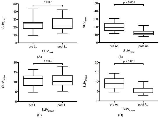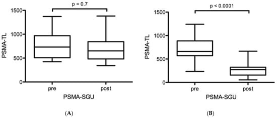 In contrast, a highly significant decrease in PSMA-ligand uptake was observed in cohort B: the mean SUVmax and SUVmean were 20.1 ± 5.4 vs. 12.3 ± 3.6 (p < 0.0001) and 9.2 ± 2.8 vs. 5.3 ± 1.8 (p < 0.0001), respectively (Figure 2B,D). Mean relative changes in SUVmax and SUVmean were −38.8% and −42.4%. The mean PSMA-SGU was 711 ± 268 vs. 276 ± 162 (p < 0.0001). Mean relative and absolute changes for PSMA-SGU were −61% and −435 (Figure 3B).