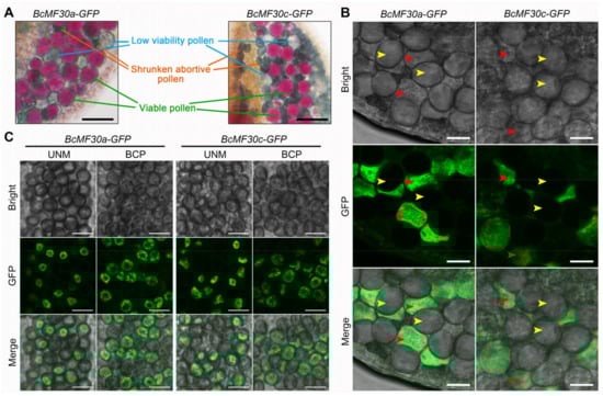 Cytological observation of pollen grains from T1 lines of BcMF30a-GFP and BcMF30c-GFP transgenic plants of Arabidopsis thaliana. (A) Alexander staining of mature pollen grains from representative T1 transgenic plants. The distribution of tricellular pollen grains (B), microspores, and bicellular pollen grains (C) expressing GFP fusion proteins in anthers from T1 lines of BcMF30a-GFP and BcMF30c-GFP plants. UNM, uninucleate microspore; BCP, bicellular pollen. Red arrows indicate transgenic pollen, and yellow arrows indicate wild-type pollen in (B). Bars = 50 μm in (A) and 20 μm in (B,C).