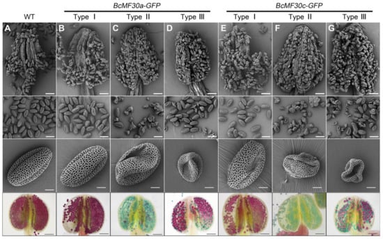 Scanning electron micrograph (SEM) observation and Alexander staining of mature pollen grains from different types of BcMF30a-GFP and BcMF30c-GFP transgenic plants of Arabidopsis thaliana. Pollen grains from wild-type (WT; (A)), Type I (B,E), Type II (C,F), and Type III (D,G) transgenic plants of BcMF30a-GFP (B–D) and BcMF30c-GFP (E,F). Bars = 50 μm, 30 μm, 5 μm, and 100 μm from the first row to the fourth row.