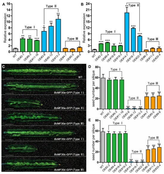 BcMF30a-GFP and BcMF30c-GFP transgenic plants with different gene expression levels show different numbers of seeds per silique. Analysis of gene expression levels in inflorescence of different types of BcMF30a-GFP (A) and BcMF30c-GFP (B) transgenic plants. TUB4 was used as a reference gene, and the gene expression level in wild-type (WT) plants was set as 1. Values are mean ± SD. (C) Representative images of fully developed siliques from different types of BcMF30a-GFP and BcMF30c-GFP transgenic plants. Bars = 2 mm. The number of seeds per silique of different types of BcMF30a-GFP (D) and BcMF30c-GFP (E) transgenic plants. Error bars represent SD, n = 30. Asterisks on columns (A,B,D,E) indicate statistically significant differences from WT calculated using Student’s t test: *, p ≤ 0.05, ** p ≤ 0.01; *** p ≤ 0.001.