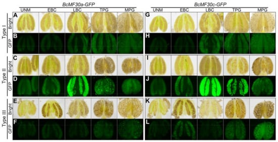 The development and GFP fluorescence signals of anthers from BcMF30a-GFP and BcMF30c-GFP transgenic plants. White field images (Bright) and epifluorescence images (GFP) of anthers from Type I (A,B,G,H), Type II (C,D,I,J), and Type III (E,F,K,L) transgenic plants of BcMF30a-GFP (A–F) and BcMF30c-GFP (G–L). UNM, uninucleate microspore; EBC, early-bicellular pollen; LBC, late-bicellular pollen; TCP, immature tricellular pollen; MPG, mature pollen grain. Bars = 100 μm.