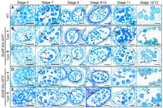 Semi-thin transverse sections of anthers from BcMF30a-GFP and BcMF30c-GFP transgenic plants. The semi-thin sections of anthers (stages 5, 7, 8, 9/10, 11, and 12/13) from wild type (WT; (A)), Type II (B,D), and Type III (C,E) transgenic plants of BcMF30a-GFP (B,C) and BcMF30c-GFP (D,E). Asterisks in (C,E) indicate microspores with less cytoplasm. MMC, microspore mother cell; Msp, microspore; P, pollen; dP, degenerated pollen; T, tapetum; Tds, tetrads. Bars = 25 μm.