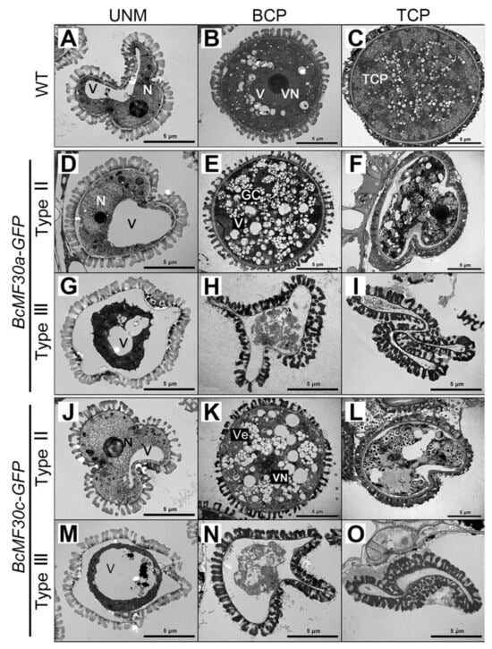 Transmission electron micrographs (TEMs) of pollen grains from BcMF30a-GFP and BcMF30c-GFP transgenic plants. Ultrastructure of pollen grains at different developmental stages from wild-type (WT; A–C), Type II (D–F,J–L), and Type III (G–I,M–O) transgenic plants of BcMF30a-GFP (D–I) and BcMF30c-GFP (J–O). BCP, bicellular pollen; GC, generative cell; N, nucleus; TCP, tricellular pollen; UNM, uninucleate microspores; V, vacuole; Ve, vesicle; VN, vegetative nucleus. Bars = 5 μm.