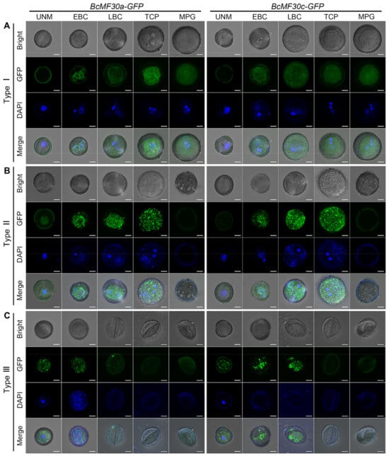 The above results demonstrated that the heterologous expression of BcMF30a or BcMF30c can lead to different pollen phenotypes. Interestingly, when observing the transgenic pollen expressing BcMF30a-GFP or BcMF30c-GFP, it could be found that GFP fluorescence signals in some pollen grains seemed to present a punctate distribution, especially during the uninucleate and binucleate stages (Figure 1C), suggesting that BcMF30a and BcMF30c may exhibit special subcellular localization under certain circumstances. So, is there a causal relationship between the subcellular localization of these two proteins in pollen and different pollen phenotypes? To explore this question, the distribution of BcMF30a-GFP and BcMF30c-GFP fusion proteins in transgenic pollen at various developmental stages and the development of pollen nuclei were examined in detail (Figure 7)