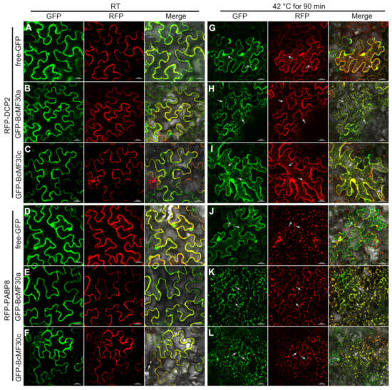 Plasmids for subcellular co-localization experiments were constructed in our previous studies, namely pFGC-BcMF30a/c-GFP, pFGC-GFP-BcMF30a/c [], pFGC-RFP-DCP2, and pFGC-RFP-PABP8 []. To investigate the co-localization of BcMF30a/c and DCP2 or PABP8, Agrobacterium-containing vectors expressing GFP-fusion proteins and RFP-fusion proteins were mixed in a ratio of 1:1 and transiently transformed into tobacco leaf epidermal cells. About 48 h later, the co-localization of fusion proteins in tobacco leaf epidermal cells at RT and under heat treatment (42 °C for 90 min) was analyzed under a confocal laser scanning microscope (A1, Nikon, Japan), using ND Acquisition tool (NIS-elements AR software) with or without Z Movement.