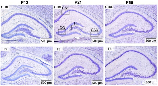 Whether febrile seizures induce the loss of hippocampal neurons remains a topic of controversy, with conflicting data from clinical studies and animal experiments [10,11,20,21]. To assess the effect of prolonged febrile seizures at P10 on neuronal damage in rats, we used Nissl staining on brain slices and determined the number of neurons in different areas of the hippocampus, including the CA1, CA3, hilus, and dentate gyrus regions, at different ages (P12, P21, and P55) (Figure 1 and Figure 2).