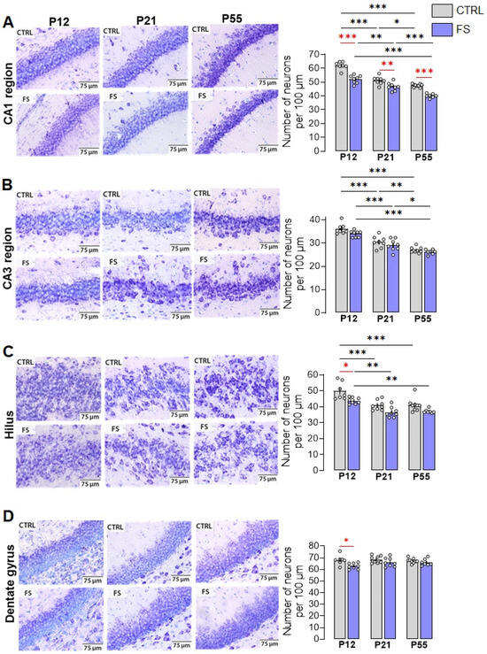 Nissl staining of neurons in hippocampal areas CA1 (A), CA3 (B), hilus (C), and dentate gyrus (D) in control (CTRL) and experimental post-FS (FS) rats. Diagrams showing the number of Nissl-stained neurons per 100 µm cell layer. The circles show the individual values for each rat. Asterisks indicate significant differences between groups according to Tukey’s post hoc test: * p < 0.05, ** p < 0.01, *** p < 0.001. Between-group differences are shown in red.