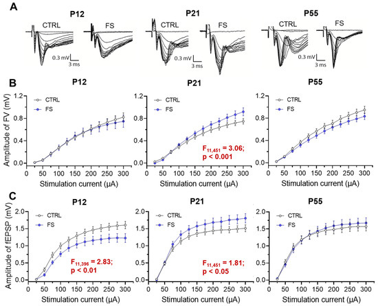 To evaluate the basic synaptic neurotransmission at the CA3–CA1 pyramidal neuron synapses in hippocampal slices, afferent fibers underwent electrical stimulation at different current intensities (25–300 mA). The synaptic neurotransmission was evaluated in both post-FS animals and control animals across different ages (P12, P21-23, P51-55; Figure 3). The fiber volley (FV) amplitude, reflecting the number of CA3 axons that evoke action potentials, and the fEPSPs amplitude, reflecting the sum of excitatory postsynaptic responses occurring in the dendrites of the CA1 pyramidal neurons in response to afferent fiber stimulation, were both recorded in each slice.