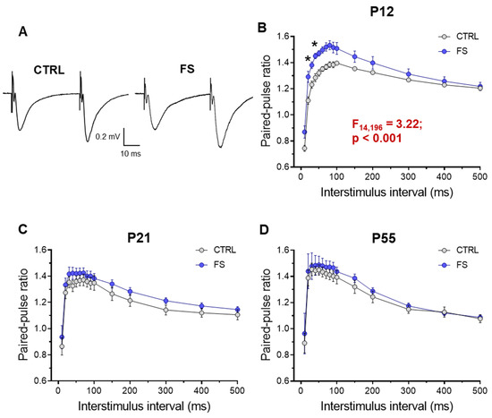 Paired-pulse facilitation altered in hippocampal slices 2 days after febrile seizures. (A) Representative examples of paired-pulse responses from the hippocampus in control rats (CTRL) and rats after febrile seizures (FS) at P12 using interstimulus intervals of 40 ms. (B–D) Diagrams of paired-pulse facilitation in rat hippocampal slices at P12 (B), P21-23 (C), and P51-55 (D) days at different interstimulus intervals. Asterisks indicate significant differences according to Tukey’s post hoc test: * p < 0.05.