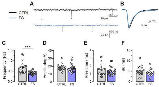 Frequency of miniature excitatory postsynaptic current (mEPSC) is reduced two days after experiencing febrile seizures. (A) Representative current responses from CA1 pyramidal neurons recorded at −80 mV and (B) examples of averaged mEPSCs in control (CTRL) and post-FS (FS) animals. The asterisks indicate individual mEPSCs. The frequency (C), amplitude (D), rise time (E), and decay time constant (F) of mEPSC in the control and post-FS groups are presented. Asterisks indicate significant differences between groups according to Student’s test: * p < 0.05, *** p < 0.001.