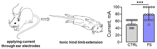 The maximal electroshock seizure threshold (MEST) increased in rats 2 months after febrile seizures. Image of a rat with tonic hind limb extension induced by applying current through ear electrodes. Diagrams illustrating the differences in threshold currents in the control (CTRL) and post-FS (FS) animals required for tonic hind limb extension. The circles show the individual values for each rat. Asterisks indicate significant differences between groups according to Mann–Whitney U test: *** p < 0.001. Data are represented as median with interquartile range.