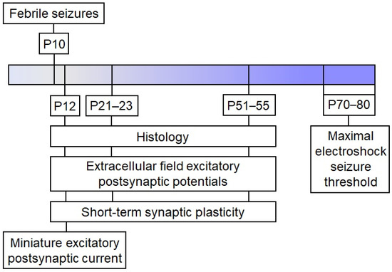 - Postnikova, T.Y.; Griflyuk, A.V.; Amakhin, D.V.; Kovalenko, A.A.; Soboleva, E.B.; Zubareva, O.E.; Zaitsev, A.V. Early Life Febrile Seizures Impair Hippocampal Synaptic Plasticity in Young Rats. Int. J. Mol. Sci. 2021, 22, 8218. [Google Scholar] [CrossRef] [PubMed]