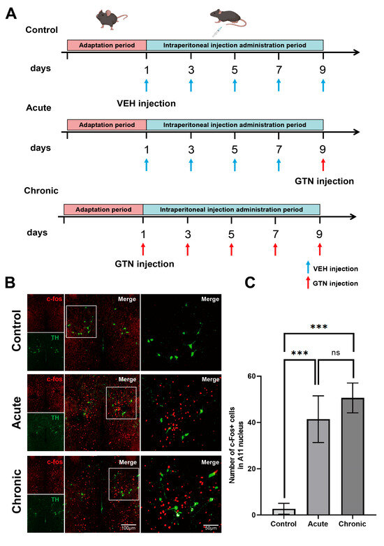Glyceryl trinitrate (GTN) was prepared from a stock solution of 5.0 mg/mL glyceryl trinitrate in 30% alcohol, 30% propylene glycol, and water (Beijing Yimin Pharmaceutical Co., Ltd., Beijing, China). GTN was freshly diluted with 0.9% saline to a solution with a concentration of 0.5 mg/mL (10 times dilution). The diluted GTN was stored in a glass bottle at 4 °C away from light to ensure that it was ready for use. The injection volume of C57 mice was 10 mg/kg, which was converted to 20 μL/g [72]. The mice were divided into three groups according to the mode of administration: control group, acute group, and chronic group. The control group was injected with vehicle every other day for a total of five injections. The acute group was injected intraperitoneally with the drug every other day for a total of five injections. The first four injections were with vehicle and the last was with GTN. The chronic group was injected with GTN every other day for a total of 5 injections (Figure 1A).
