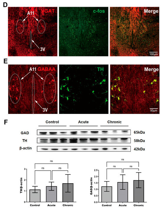Phase I modeling and functional exploration of the A11 nucleus in the model. (A) Flow chart of the experiment. (B–E) Functional exploration of the A11 nucleus in the model and components. (B) The c-fos expression of A11 motifs in the control, acute, and chronic groups. TH (green) is used to indicate the position of A11 motifs, and the amount of c-fos (red) is used to characterize the activation degree of A11 motifs in each group, with a higher number representing a higher activation degree. (C) The number of c-fos+ cells in the A11 nucleus was counted in the three groups (control group: n = 10 mice per group, acute group: n = 9 mice per group, chronic group n = 8 mice per group) (D) Colocalization of VGAT+ (GABAergic neurons, red) neurons with c-fos+ (green) neurons in the A11 nucleus in the migraine model (acute vs. chronic groups). (E) Colocalization of TH+ (dopaminergic neurons, green) neurons with GABAA receptor+ (red) neurons in the A11 nucleus. (F) Differences in GAD (glutamic acid decarboxylase, used to characterize metabolic levels of GABAergic neurons) and TH (tyrosine hydroxylase, used to characterize metabolic levels of dopaminergic neurons) protein expression in the A11 nucleus among the three groups (n = 6 per group). Significance was assessed by Kruskal–Wallis H test with Mann–Whitney U post hoc comparison between groups (C; *** p < 0.001; ns, no significance) or by one-way ANOVA with post hoc comparison between groups (F; ns, no significance). All data are presented as the mean ± S.E.M.