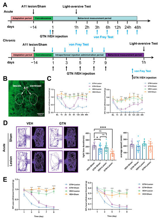 Phase II modeling and behavioral validation. (A) The GTN acute intervention group was treated with bilateral A11 nucleus dopaminergic neuron-specific injury or sham surgery after a brief acclimatization period. GTN or VEH was injected intraperitoneally 14 days after surgical recovery. The light and dark box test was performed 1 h after intraperitoneal injection, and the von Frey test was performed before and 1 h, 2 h, 3 h, 6 h, 12 h, 24 h, and 48 h after intraperitoneal injection (different batches of mice were used for the light and dark box test and the von Frey test). The GTN chronic intervention group had the same acclimatization and surgical and recovery periods as the acute group. The difference was that at the end of the recovery period, intraperitoneal injections of GTN or VEH were performed every other day for a total of 5 injections. The von Frey test was performed before each intraperitoneal injection. Photophobic behavioral tests were performed 1 h after the last intraperitoneal injection. (B) Staining plots of the unilateral A11 nucleus 14 days after 6-OHDA injection, with the number of TH+ (green) neurons used to characterize the extent of the damage. Unilateral injection was a convenient control, and all A11 damage in the experiment was bilateral. (C) Cephalic and facial pain thresholds and hind paw mechanical pain thresholds were measured in the GTN acute intervention group (n = 8 mice per group). & p < 0.05, && p < 0.01, &&&& p < 0.0001 GTN + lesion group vs. GTN + Sham group. @ p < 0.05, @@ p < 0.01, @@@ p < 0.001, @@@@ p < 0.0001 GTN + lesion group vs. VEH + lesion group. * p < 0.05, ** p < 0.01, *** p < 0.001, **** p < 0.0001 GTN + lesion group vs. VEH + Sham group. (D) Photophobic behavioral assays in the GTN acute intervention group (VEH + Sham: n = 15 mice per group; VEH + lesion: n = 13 mice per group; GTN + Sham: n = 14 mice per group; GTN + lesion: n = 17 mice per group). (E) Cephalofacial pain thresholds and hind paw mechanical pain thresholds were determined in the GTN chronic intervention group (n = 8 mice per group). && p < 0.01, &&& p < 0.001 GTN + lesion group vs. GTN + Sham group. @@@ p < 0.001, @@@@ p < 0.0001 GTN + lesion group vs. VEH + lesion group. ** p < 0.01, *** p < 0.001, **** p < 0.0001 GTN + Lesion group vs. VEH + Sham group. (F) Photophobic behavioral measurements in the GTN chronic intervention group (VEH + Sham: n = 13 mice per group; VEH + lesion: n = 12 mice per group; GTN + Sham: n = 8 mice per group; GTN + lesion: n = 9 mice per group). The significance of C, E was assessed by two-way repeated-measures with ANOVA Tukey’s multiple comparisons test between groups (C (left): main group effects: F (3, 28) = 88.82, p < 0.0001, main time effects: F (5.152, 144.3) = 8.232, p < 0.0001. Interaction between group and time: F (21, 196) = 4.006, p < 0.0001; C (right): main group effects: F (3, 28) = 64.24, p < 0.0001, main time effects: F (5.207, 145.8) = 6.211, p < 0.0001. Interaction between group and time: F (21, 196) = 2.324, p = 0.0014; E (left): main group effects: F (3, 28) = 82.01, p < 0.0001, main time effects: F (2.740, 76.71) = 30.95, p < 0.0001. Interaction between group and time: F (12, 112) = 9.329, p < 0.0001; E (right): main group effects: F (3, 28) = 30.92, p < 0.0001, main time effects: F (3.537, 99.05) = 40.66, p < 0.0001. Interaction between group and time: F (12, 112) = 5.992, p < 0.0001). Significance of D, F was assessed by one-way ANOVA with post hoc comparison between groups (D; * p < 0.05, **** p <0.0001; ns, no significance; F; ** p < 0.01, *** p < 0.001, **** p <0.0001; ns, no significance). All data are presented as the mean ± S.E.M. The mean ± S.E.M. is the mean ± S.E.M. of the post hoc comparison.