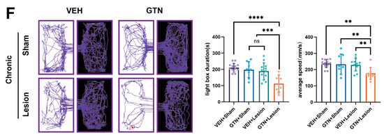 In addition to mechanical pain sensitization of the head, face, and hind paws, we used a modified light/dark box to assess light aversion behavior (photophobia). According to the results of our team’s previous experiments, during the first 50 min after GTN injection, mice showed a significant reduction in locomotor activity due to the cardiovascular effects (hypotension) of GTN. As a result, these mice were inactive in the box for more than 90% of the time. Previous studies have shown that GTN model mice exhibit photophobic behavior 1 h after intraperitoneal injection of GTN, which is mainly reflected by the time spent in the bright box and the number of jumps between the bright and dark boxes. Therefore, we performed photophobia experimental measurements 1 h after GTN administration. For both acute and chronic GTN-treated mice, the GTN + lesion group showed more significant photophobic behavior than the other three groups (Figure 2D,F, acute: VEH + Sham vs. GTN + Sham vs. VEH + lesion vs. GTN + lesion = 213.12 ± 35.56 vs. 172.37 ± 54.55 vs. 187.69 ± 60.94 vs. 100.91 ± 39.67; Figure 2F, chronic: VEH + Sham vs. GTN + Sham vs. VEH + lesion vs. GTN + lesion = 210.22 ± 26.59 vs. 197.65 ± 49.04 vs. 188.88 ± 51.78 vs. 112.11 ± 50.91).