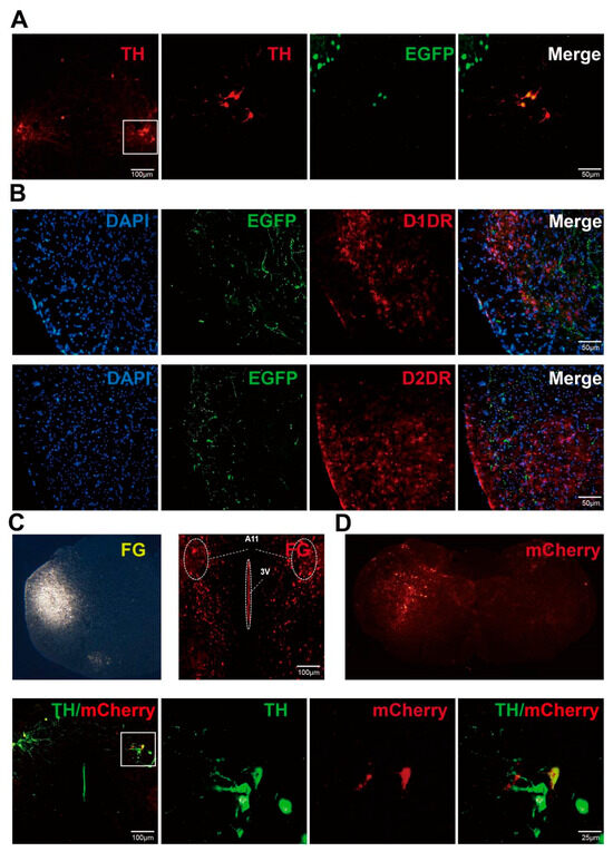 Paracrine and retrograde neuronal tracing of the A11 nucleus projected to SP5C. (A) Paracrine tracer virus pAAV-EF1-DIO-EGFP-WPRE was injected into the bilateral A11 nucleus of TH-cre mice and stained after 21 days of expression. TH+ (red) neurons were colocalized with pAAV-EF1-DIO-EGFP-WPR (green)-expressing neurons. (B) Fibers of pAAV-EF1-DIO-EGFP-WPRE projected to SP5C (green) colocalized with D1DR (red) and D2DR (red), respectively. (C) Fluorescent gold injected into SP5C (left panel) as well as FG+ (red) cytosolic bodies were found in the bilateral A11 nucleus. (D) Retrograde tracer viral pAAV-hSyn-DIO-mCherry-WPRE (red) injection sites in SP5C. pAAV-hSyn-DIO-mCherry-WPRE (red) projected to the bilateral A11 nucleus colocalized with TH+ (green) neurons.