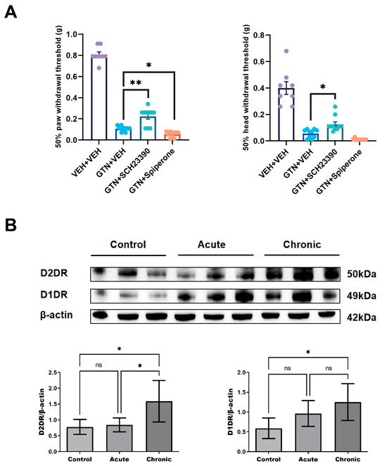 Pain behavioral measurements after modulation of dopamine receptors in SP5C and changes in dopamine receptor expression levels in different groups. (A) Behavioral changes after acute GTN intervention and administration of brain regions injected with the D1DR antagonist and D2DR antagonist (VEH + VEH: n = 8 mice per group, GTN + VEH: n = 10 mice per group, GTN + SCH23390: n = 10 mice per group; GTN + spiperone: n = 10 mice per group) (B) Changes in D1DR and D2DR protein expression levels in SP5C of the control, acute, and chronic stimulation groups (n = 6 mice per group). Significance was assessed by one-way ANOVA with post hoc comparison between groups (A, B; * p < 0.05, ** p < 0.01; ns, no significance). All data are presented as the mean ± S.E.M. The mean ± S.E.M. of the post hoc comparisons is shown in the table below.