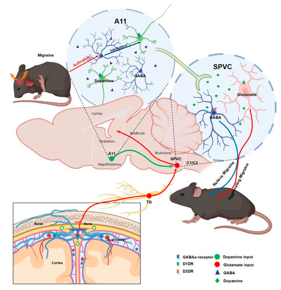 Some studies have found that the A11 nucleus contains a small number of CGRP+ neurons in addition to DA neurons and GABA neurons, and that these neurons are dual TH+/CGRP+ immunoreactive neurons [13,56]. These neurons are predominantly located on the caudal side of the A11 nucleus [70], and no study has yet explored the role of these dual-immunopositive neurons in migraine. Unraveling the mechanism of influence of dual TH+/CGRP+ immunoreactive neurons in the A11 nucleus is significant for understanding headache transmission.