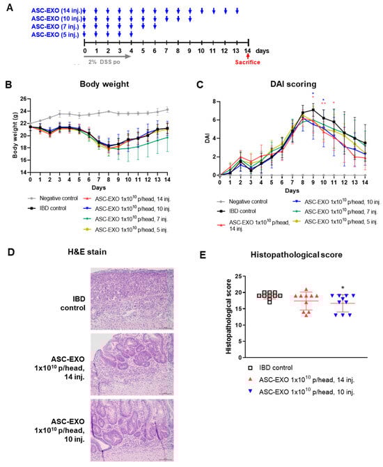 Effects of ASC-EXO treatment frequency on an acute IBD model. A total of 52 mice were divided into a negative control group, IBD control group, and four experimental groups with the negative control group containing two mice, IBD control group containing ten mice, and ASC-EXO treatment group containing ten mice. (A) Scheme of study design. Blue arrow means when ASC-EXO is administered and red arrow means the animal sacrifice point. (B) Body weight. (C) DAI scores of mice were recorded daily from day 0 to 14. Red star means the data with a statistically significant difference between the IBD control and the ASC-EXO 1 × 1010, 14 inj. group, and blue star means the data with a statistically significant difference between the IBD control and the 1 × 1010, 10 inj. group. (D) Large intestine tissue analyzed in H&E staining on day 10 (scale bar = 100 μm). The data are presented as representative images from three independent experiments. (E) Histopathological scores. The data are presented as the means ± SD with significance at * p < 0.05 and ** p < 0.01 compared to IBD control. Abbreviations: Negative control: group without IBD induction; IBD control: IBD induction group; ASC-EXO 1 × 1010, 5 inj.: ASC-EXO 1 × 1010 particles/head, administered five times; ASC-EXO 1 × 1010, 7 inj.: ASC-EXO 1 × 1010 particles/head, administered seven times; ASC-EXO 1 × 1010, 10 inj.: ASC-EXO 1 × 1010 particles/head, administered ten times; ASC-EXO 1 × 1010, 14 inj.: ASC-EXO 1 × 1010 particles/head, administered fourteen times.