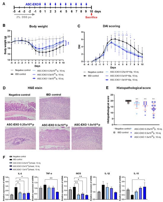 Dose-dependent effects of ASC-EXOs on an acute IBD model. A total of 50 mice were divided into a negative control group, an IBD control group, and three experimental groups, with each group containing ten mice. (A) Scheme of study design. Blue arrow means when ASC-EXO is administered and red arrow means the animal sacrifice point. (B) Body weight. (C) DAI scores of mice were recorded daily from day −5 to 10. (D) Large intestine tissue analyzed via H&E staining on day 10 (scale bar = 100 um). The data are presented as representative images from six independent experiments. (E) Histopathological score. (F) Quantitative real-time PCR for M1 markers IL-6, TNF-α, and iNOS, IL-1β, and M2 marker IL-10 in large intestine tissue (n = 5 mice per group). The data are presented as means ± SD with significance at * p < 0.05, ** p < 0.01, and *** p < 0.001 compared to IBD control. Abbreviations: Negative control: group without IBD induction; IBD control: IBD induction group; ASC-EXO 0.25 × 1010, 10 inj.: ASC-EXO 0.25 × 1010 particles/head, administered ten times; ASC-EXO 0.5 × 1010, 10 inj.: ASC-EXO 0.5 × 1010 particles/head, administered ten times; ASC-EXO 1 × 1010, 10 inj.: ASC-EXO 1 × 1010 particles/head, administered ten times.