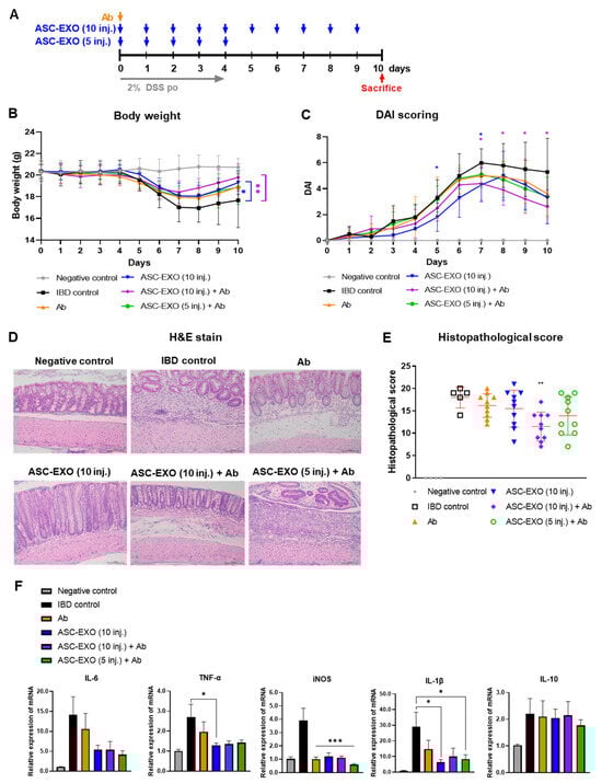 Co-administration effect of ASC-EXOs with anti-IL-12 p40 on an acute mouse model. A total of 50 mice were divided into a negative control group, an IBD control group, and four experimental groups, with the negative control containing four mice, IBD control group containing six mice, and each experimental group containing ten mice. (A) Scheme of study design. Blue arrow means when ASC-EXO is administered, orange arrow means when Ab (IL-12 p40) is administered, and red arrow means the animal sacrifice point. (B) Body weight. (C) DAI scores of mice were recorded daily from day 0 to day 10. Blue star means the data with a statistically significant difference between the IBD control and the ASC-EXO 1 × 1010, 10 inj. group, and violet star means the data with a statistically significant difference between the IBD control and the1 × 1010, 10 inj. + Ab group. (D) Large intestine tissue analyzed in H&E staining on day 10 (scale bar = 100 μm). The data are presented as representative images from six independent experiments. (E) Histopathological score. (F) Quantitative real-time PCR for M1 markers IL-6, TNF-α, iNOS, IL-1β and M2 marker IL-10 in large intestine tissue (n = 5 mice per group). The data are presented as the means ± SD with significance at * p < 0.05, ** p < 0.01, and *** p < 0.001 compared to IBD control. Abbreviations: Negative control: group without IBD induction; IBD control: IBD induction group; Ab: anti-IL-12 p40 administration group; ASC-EXO (10 inj.): ASC-EXO 1 × 1010 particles/head, administered ten times; ASC-EXO (5 inj.), ASC-EXO 1 × 1010 particles/head, administered five times.