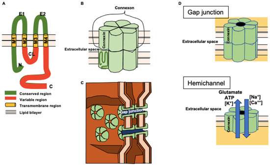 - Lapato, A.S.; Tiwari-Woodruff, S.K. Connexins and pannexins: At the junction of neuro-glial homeostasis & disease. J. Neurosci. Res. 2018, 96, 31–44. [Google Scholar] [PubMed]