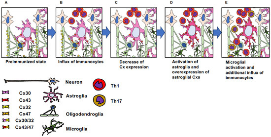 Cx imbalance induces CNS inflammation. (A) Each glial cell connected by Cxs except for microglia in the normal state. (B) Infiltration of the CNS parenchyma by autoreactive T cells when EAE is induced. (C) Decrease in Cxs on both astroglia and oligodendroglia in the acute stage of EAE. (D) Expression of an excess level of Cx43 by activated astroglia in the peak phase of EAE, while oligodendroglial Cx47 expression remains decreased. As a result, uncoupled Cx43 hemichannels are increased. Microglia are also activated. (E) Elevated levels of extracellular ATP, adenosine, and glutamate triggering the activation of other glial cells and endothelial cells, resulting in increased cytokines and chemokines. Consequently, this leads to a substantial influx of peripheral immune cells.
