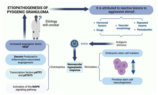 Several researchers define the PG as a “reactive” or “reparative” process. Regezi et al. consider PG a reactive or repairing process in which a certain stimulus generates an exuberant proliferation of connective tissue [,]. The etiological factors considered as stimuli that trigger this reactive process are trauma, dental calculus, dental biofilm, chronic irritation, pre-existing vascular lesions, chronic irritation due to exfoliation of primary teeth, injury of a primary tooth, eruption of permanent teeth, defective restorations in the area of the lesion, occlusal interference, food impaction, periodontitis, and trauma from toothbrushing [,,]. These factors are summarized in Figure 1.