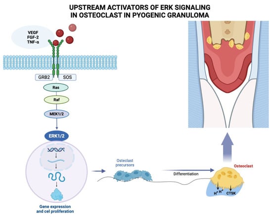 Growth factors such as vascular endothelium-derived growth factor (VEGF), fibroblast growth factor-2 (FGF-2), tumor necrosis factor α (TNF-α) among other molecules, bind to the extracellular domain of a receptor tyrosine kinase that acts with docking sites for GRB2 adapter proteins that also binds to a guanine nucleotide exchange factor SOS, for a protein called Ras, which activates another signaling protein called Raf, acting on the MEK substrate 1/2, which phosphorylates and activates ERK 1/2, which enters the nucleus where it activates specific transcription factors and genes involved in the proliferation of osteoclast precursors that differentiate into mature osteoclasts that will resorb the bone crest in the pyogenic granuloma area. Figure created with BioRender, © biorender.com.