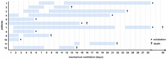 Timeline of sampling. Samples from 12 COVID-19 patients were analyzed in this study (134 samples in total). Sampling was initiated on the day of intubation. Blue frames indicate sampling, (♦) marks extubation, and (†) death of patients.
