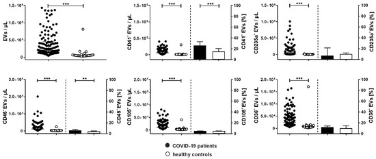 Cellular origin of extracellular vesicles in COVID-19 patients. Extracellular vesicles in COVID-19 patients (n = 134; black) and healthy controls (n = 25; white) were characterized by flow cytometry and stained by a combination of anti-CD41 as platelet marker, anti-CD235a as red blood cell marker, anti-CD45 as leukocyte marker, anti-CD105 as endothelial marker, and anti-CD36 to detect platelet glycoprotein IV as described in Section 4. Annexin V (Anx5) was used as marker for EVs exposing phosphatidylserine. Data are given as median [IQR; interquartile range] and were compared using the Mann–Whitney test (** p < 0.01, *** p < 0.001).