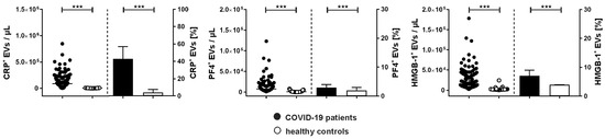 Association of extracellular vesicles with CRP, PF4, and HMGB-1 in COVID-19 patients. Characterization of EVs carrying C-reactive protein (CRP+), platelet factor 4 (PF4+), and high mobility group box-1 protein (HMGB-1+) in plasma samples from COVID-19 patients (n = 134; black) in comparison to healthy controls (n = 25; white) using flow cytometry. Data are given as median [IQR] and were compared using the Mann–Whitney test (*** p < 0.001).