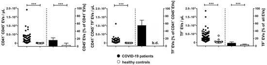 Aggregate formation between platelet-derived and leukocyte-derived EVs and TF expression on EVs in COVID-19 patients. Extracellular vesicles in COVID-19 patients (n = 134; black) and healthy controls (n = 25; white) were characterized by flow cytometry. Aggregates of platelet- and leukocyte-derived EVs were identified as CD41+CD45+ events in the EV gate as described in Section 4 (left: EV counts/µL and the percentage of platelet EVs carrying CD45 as leukocyte marker are shown). A total of 55.5% of CD41+CD45+ EVs in COVID-19 patients expressed TF (middle). Overall, TF expression on EVs was significantly enhanced in COVID-19 patients (right). Data are given as median [IQR] and were compared using the Mann–Whitney test (*** p < 0.001); b.d., below detection.