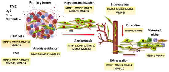 MMPs and the metastatic process. Tumor microenvironment (TME) conditions provoke the expression of MMPs, which defines stem cells’ behaviors, allows neoplastic cells to acquire mesenchymal characteristics through the epithelial–mesenchymal process (EMT), and induces anoikis resistance, which prevents cell death when they detach from the extracellular matrix (ECM) and neighboring cells. MMPs have an important role in angiogenesis, cell migration, invasion, intravasation, and extravasation. They also participate in the formation of the metastatic niche.