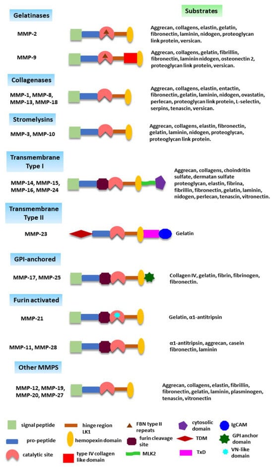 The MMPs’ family includes 28 members in vertebrates, of which only 24 have been identified in humans [7,8]. They are zinc–calcium-ion-dependent endopeptidases grouped according to their protein domains’ arrangement and substrate specificity in gelatinases, collagenases, stromelysins, transmembrane type I MMPs, transmembrane type II MMPs, glycosyl-phosphatidylinositol (GPI)-anchored MMPs, matrilysins, and other MMPs with peculiar characteristics that do not allow them to be included in the previous groups (Table 1) [7].