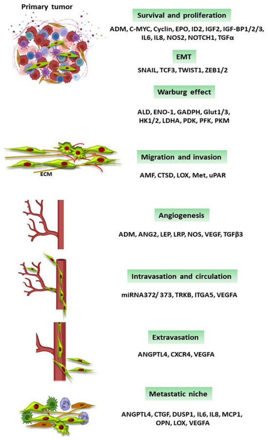 HIFs are involved in the transcription of different genes that participate in glucose transport, glycolysis, neoplastic cell survival, proliferation, angiogenesis, migration and invasion, and the preparation of the metastatic niche. Some of these genes are shown in Figure 3.