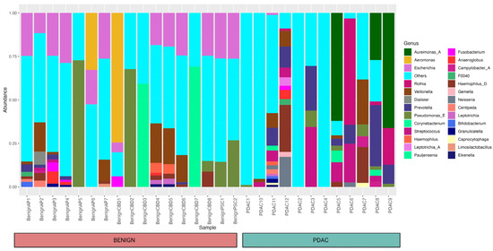 Bar plot showing the relative abundance of different bacteria within each sample and cohort at the genus level. A total of 135 genera from 29 individuals (12 PDAC and 17 benign) were identified, and a relative abundance of 10% and above was included in the figure. Forty-one different taxa that were not mapped to any bacteria at the genus level were clustered under “others” for the simplicity of this figure.